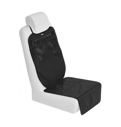 Cette protection de siège à hauteur réglable offre une couverture complète en deux parties : l'une protège la banquette arrière, tandis que l'autre s'insère sous le siège de l'enfant.