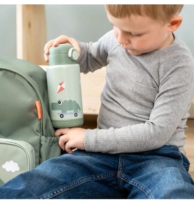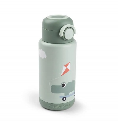 Dans une teinte vert clair, cette gourde est ornée d'un croco bienveillant et de Birdee bourdonnante.