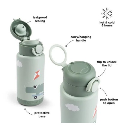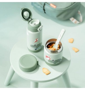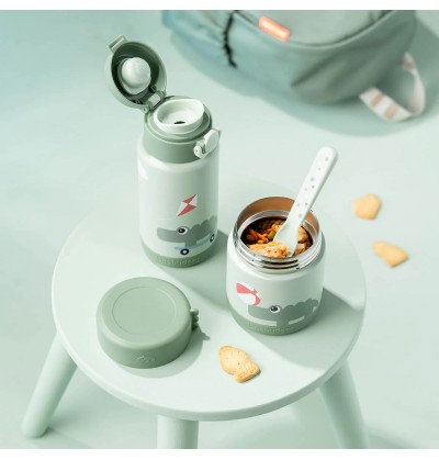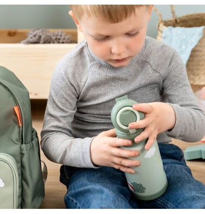 Des détails bien pensés permettent aux enfants de se débrouiller seuls : un couvercle à bouton-pression conçu pour les petits doigts, un joint en silicone sûr pour éviter les accidents dans les sacs à dos et une poignée de transport pratique pour aller de l'avant.