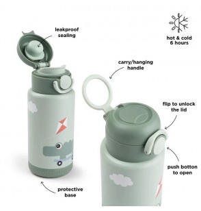 Cette gourde isotherme en acier inoxydable est conçue pour résister aux chocs quotidiens, aux moments de désordre et à toutes les aventures que votre enfant peut lui faire vivre.