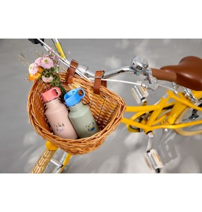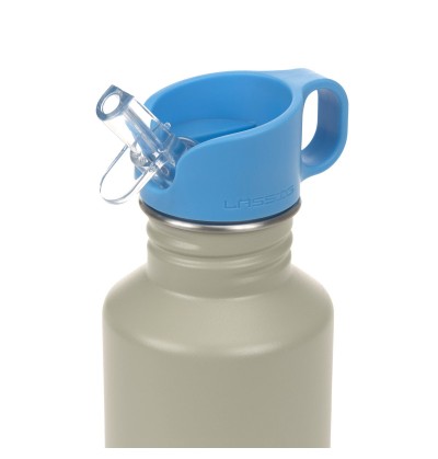 La gourde, sans BPA, est dotée d'une large ouverture pour la remplir facilement, et de deux bouchons différents : un bouchon à vis pratique avec une boucle en inox pour la porter ou la fixer facilement ; et un bouchon sport qui permet aux enfants plus jeunes de boire seuls.