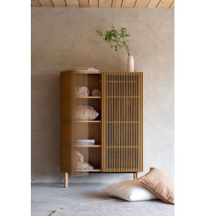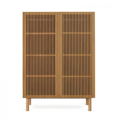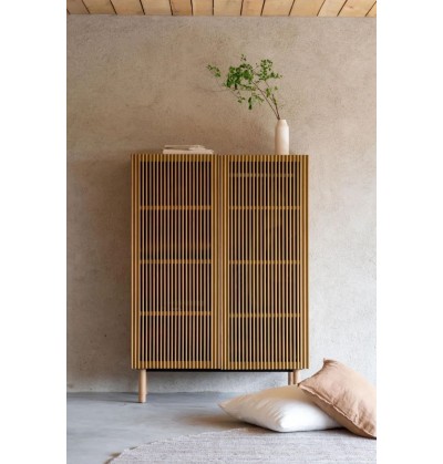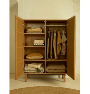 Avec ses panneaux en MDF revêtus de placage en chêne, ses portes dotées de barreaux en chêne massif et ses pieds en chêne massif, cette armoire ajoute une élégante harmonie entre beauté naturelle et design de qualité à n'importe quelle pièce.