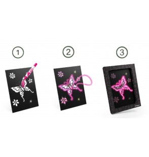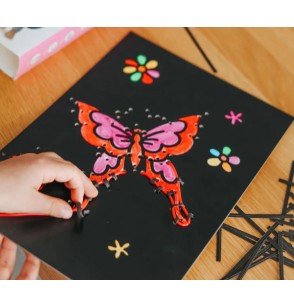 Grâce à un fil effet néon à insérer dans une planche pré-perforée, les enfants réalisent des tableaux brillants, originaux et fièrement exposables.
