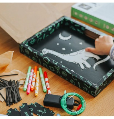 Grâce à un fil effet néon à insérer dans une planche pré-perforée, les enfants réalisent des tableaux brillants, originaux et fièrement exposables.