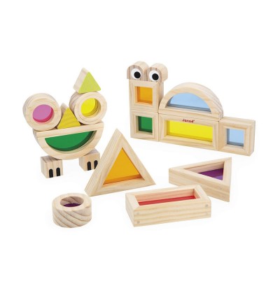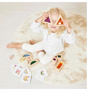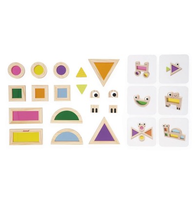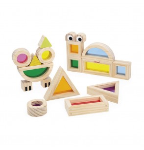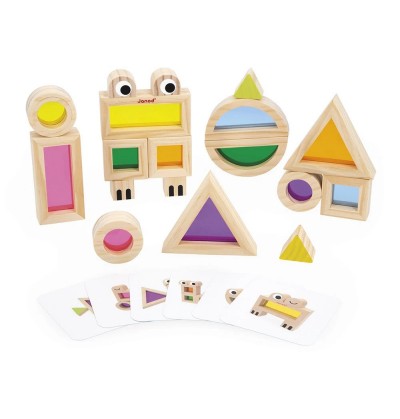 12 formes géométriques colorées transparentes sont incluses (orange, rose, jaune, violet, bleu et vert) et 6 blocs en bois sont imprimés avec des yeux, des pattes ou des oreilles.
