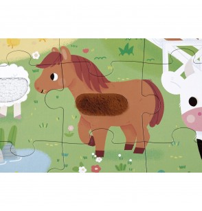 Après avoir réalisé un beau puzzle de 20 pièces, ils pourront découvrir différentes textures et matières un peu partout sur le puzzle et développeront ainsi leur sens du toucher et de l'observation.