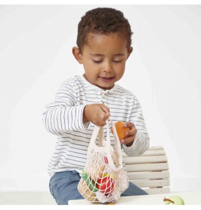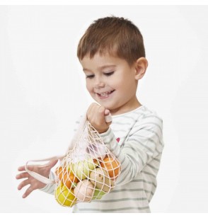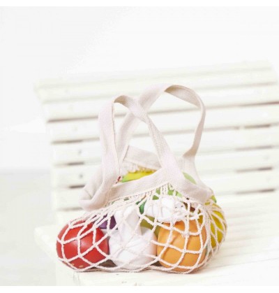 Soit 6 légumes et 6 fruits, le tout présenté dans un filet en tissu pour les transporter.