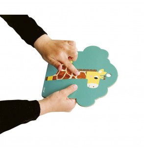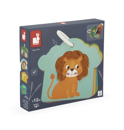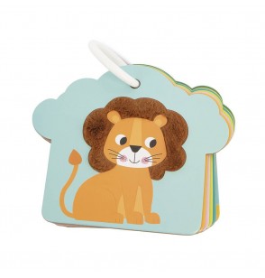 Sur ces cartes en carton, de grandes zones de différentes textures permettent aux petites mains de se familiariser avec les différentes matières : la crinière toute douce du lion ou la peau rugueuse du crocodile.