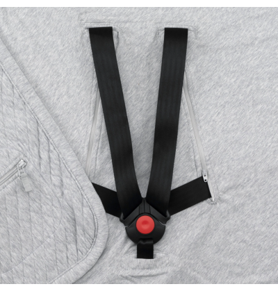 La couverture enveloppante s'installe directement sur la coque et grâce à son ingénieux système d'ouvertures zippées, il est très simple de faire passer les ceintures afin de fermer correctement le harnais de sécurité au plus près du corps de bébé.