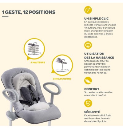 Son dossier inclinable qui peut être ajusté en position assise, intermédiaire ou allongée offre à l’enfant différentes positions lui permettant de s’éveiller ou de se reposer sereinement.