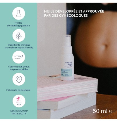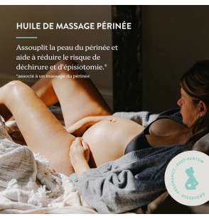 Huile de massage naturelle spécialement conçue pour favoriser la souplesse et l'élasticité des tissus périnéaux.