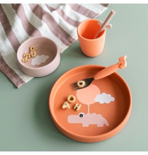 Une assiette de couleur Papaye, un bol en forme de nuage et une mini tasse en corail font de ce set de repas pour enfants une idée de cadeau parfaite pour les petits mangeurs.