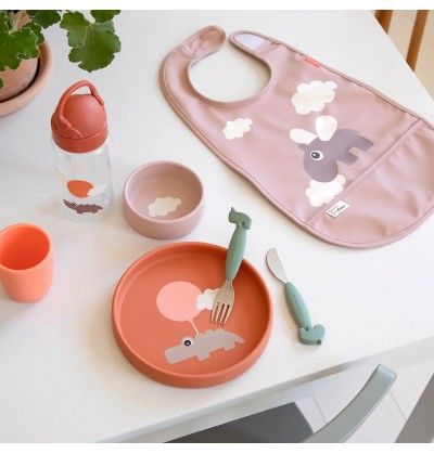 Pratique, ce set de départ en silicone antidérapant et facile à prendre en main comprend une assiette pour enfant, un bol et une mini tasse.