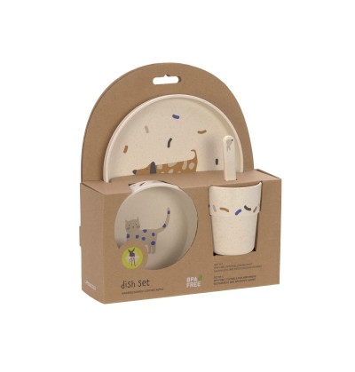 L’ensemble est composé d’une assiette, d’un bol, d’une tasse et d’une cuillère.
